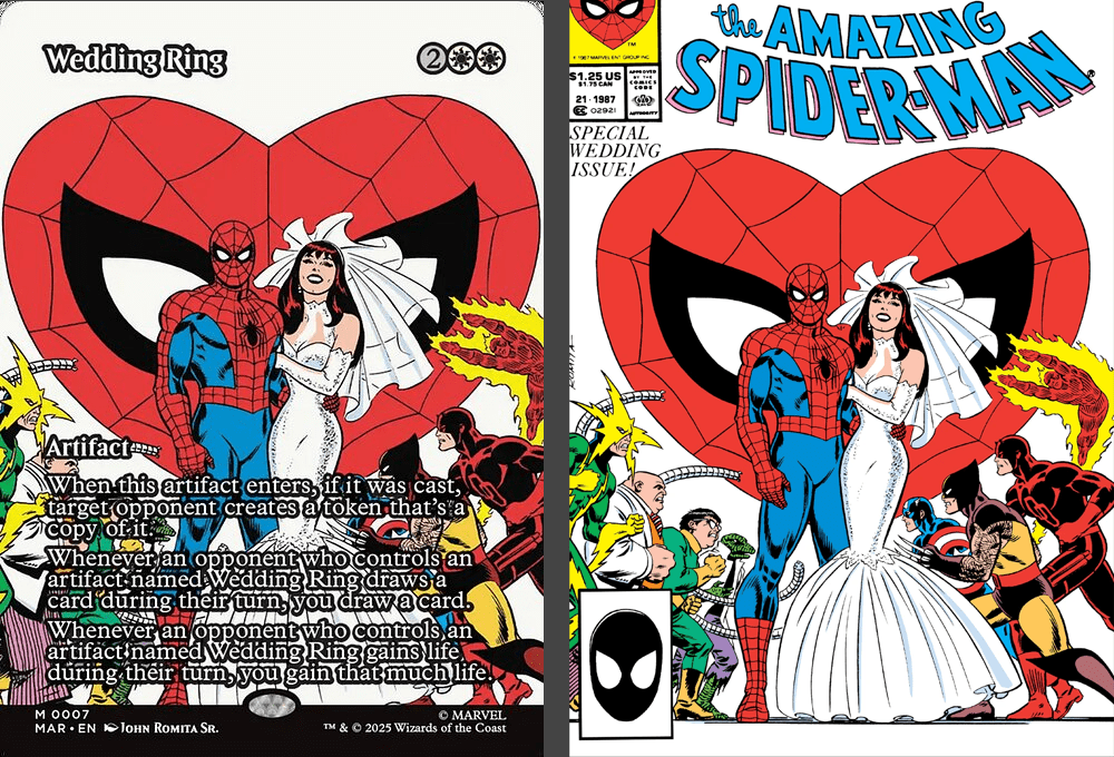 If we’re talking about a single most iconic cover from Spider-Man, it might be this one (or more likely, the traditional version where Peter Parker is in a normal wedding suit). Weddings rarely work in comics. Giving a hero a stable relationship removes a lot of potential for easy drama. Also, breaking up weddings is a very villainous act, so they often fail to finish. Peter Parker and the new Mary-Jane Watson Parker are rare among comic book characters; not only did they get married once, but across multiple retellings of the story, they keep finding each other.