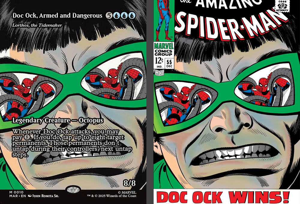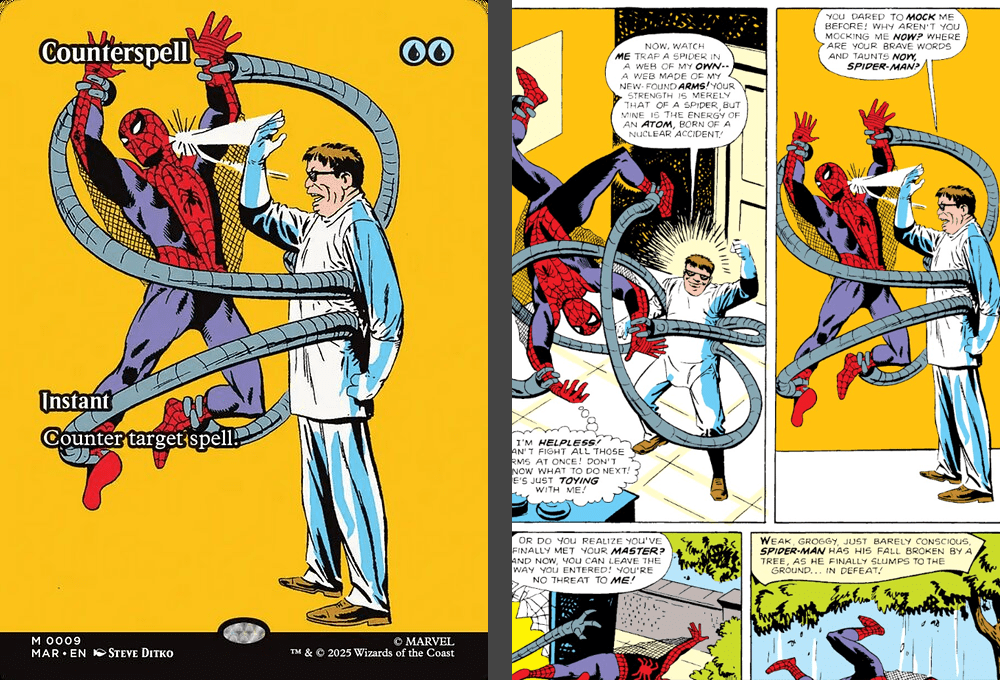 Going from not terribly iconic back to character-defining, this is from the third issue of Amazing Spider-Man, and the debut of Doctor Octopus. The background of the card is yellow because, as you can see, the background of the panel, and most of the fight panels before it, were yellow due to the yellow wall of the room they’re fighting in. Peter Parker then attends a guest lecture by The Human Torch, who provides the brand recognition and motivation to go back and win the rematch.